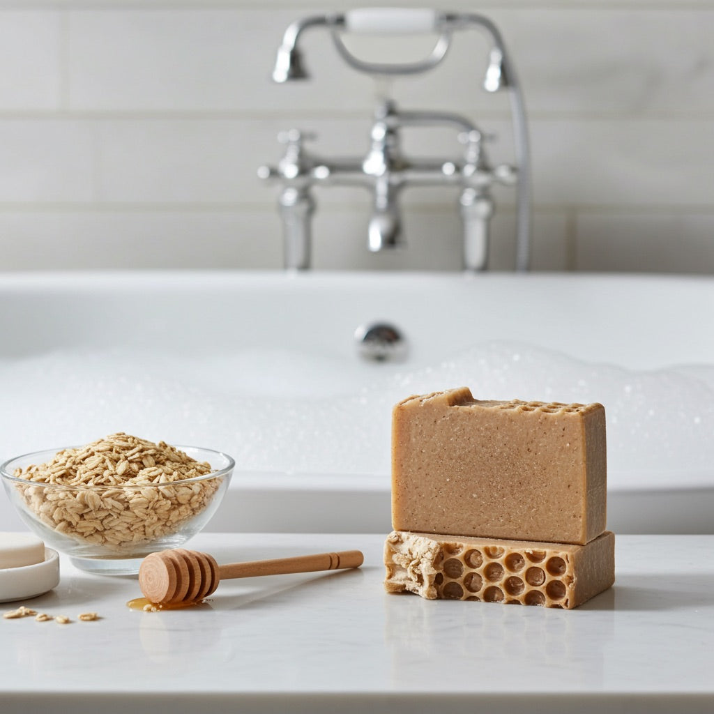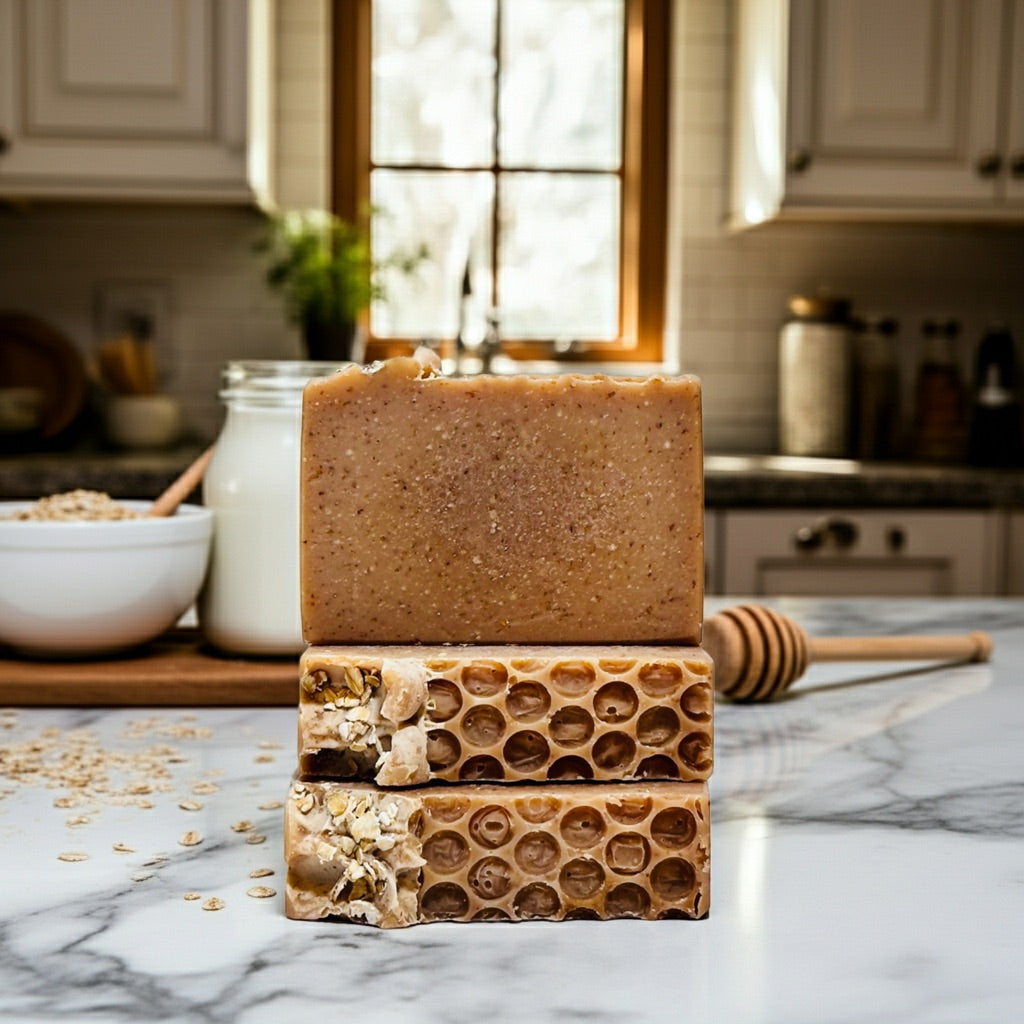 Indulge your skin in the warm, soothing embrace of our Oatmeal, Milk & Honey soap. This gentle bar is a timeless favorite—crafted with finely ground oats for mild exfoliation, nourishing coconut milk, and a subtle, sweet scent that blends golden honey with hints of vanilla. Ideal for anyone seeking a nourishing, gentle scrub that’s kind to the skin and perfect for daily use.